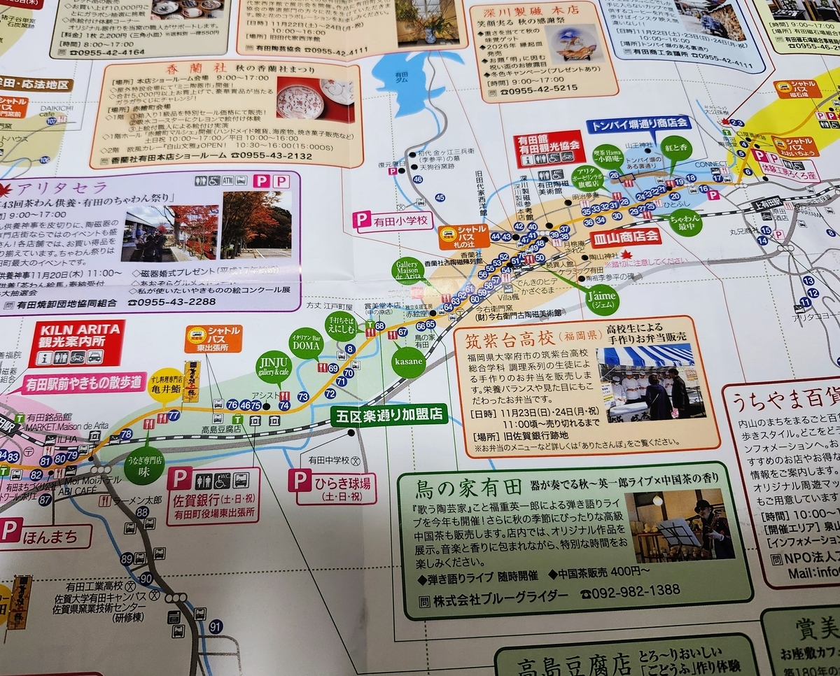 地図を見ても分かるように、有田駅~上有田駅の約3キロメートルの間でも「上有田駅」周辺にお店が集中しているので、春の陶器市のように3キロメートルびっしり歩かなくてもいいので、ゆっくりまったり歩いて回れるのが秋の陶器市の魅力の1つだと思います☆